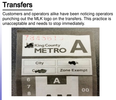 It’s up to us to stop the nonsense. If you receive a bus transfer that has the image of Dr. King punched out please take time to write down the route number, bus number (which is usually on both the front and back of the coach), day of the week and time of day that you received it. Then either call (206) 553-3000 or use the following link to report it: https://kingcounty-metro.force.com/customers/cs_app#/cs/driver.