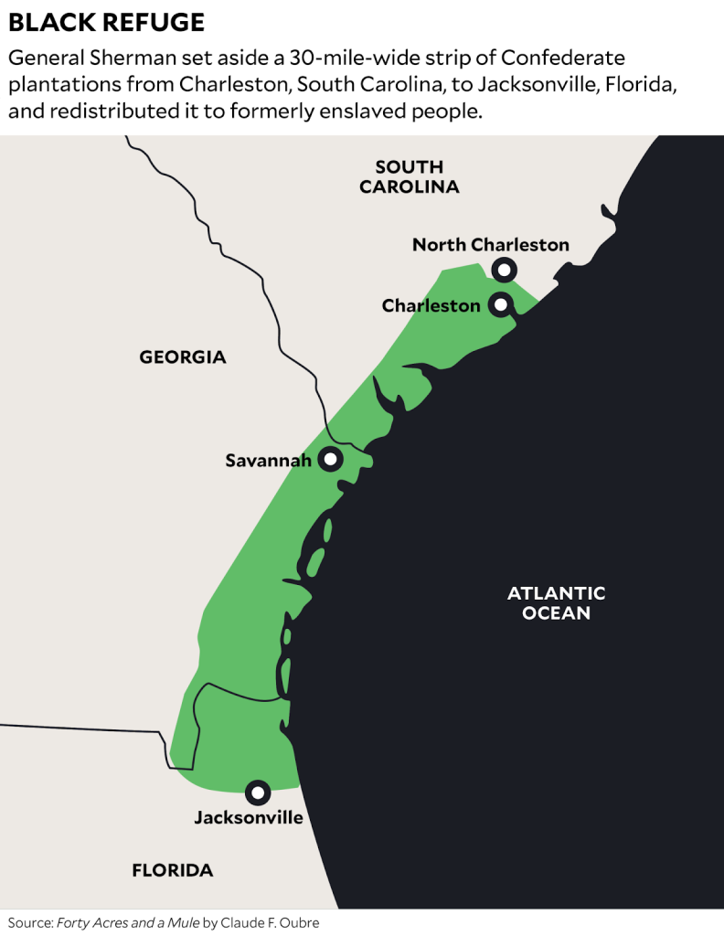 Sherman freed thousands during his march through the South, later writing that “freedmen, in droves, old and young, followed [our troops] to reach a place of safety.” On January 16, 1865, at the urging of Savannah’s Black ministers, Sherman issued an edict called Special Field Orders, No. 15, which reserved large swaths of coastal South Carolina, Georgia, and northeastern Florida for the formerly enslaved to live and work on and govern themselves.
