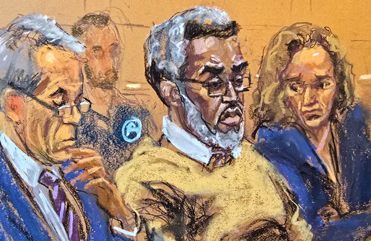 Sean “Diddy” Combs is seen with his attorneys in this courtroom sketch during a court appearance in October 2025. (Jane Rosenberg/Reuters via CNN Newsource)