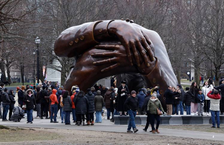 The 20-foot tall, 40-foot wide “The Embrace” statue was unveiled Friday on Boston Common, where King gave a speech on April 23, 1965, to a crowd of 22,000. The statue was inspired by a photograph of King and Scott King which captured them hugging after he won the Nobel Peace Prize in 1964.