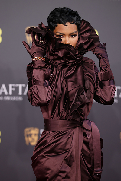 Teyana Taylor is carving out a name for herself as a red carpet vixen, — setting her own terms on how a movie star should appear in the arena of fashion. For her latest look at the BAFTAs, in which she was up for best supporting actress for “One Battle After Another,” Taylor wore a deep maroon-colored Burberry gown that wrapped every inch of her body (and then some) in a satin-like finish. The tall, vampyric popped collar, which she peeped out of overtop, was powerful and gloriously villainous.
