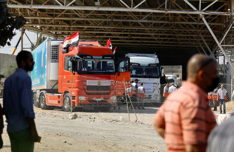 Trucks carrying aid arrive at the Palestinian side of the border with Egypt in Rafah in southern Gaza, on October 21. (Ibraheem Abu Mustafa/Reuters)