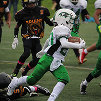 In our final regular season game of the week, we had a battle of unbeatens. The Benson Bruins visited the Rainier Ravens in a highly touted 8U matchup that lived up to the hype. The first half was a defensive storm for both teams. There were tackles for a loss, several sacks, and a few fumbles that were caused. Although the Ravens drove down the field on their drives, the Bruins defensive effort was able to hold them scoreless in the first half. The Bruins had a few big gains on their first half possessions, but the defense of the Ravens was determined to keep them from getting in the end zone.