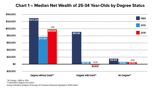 For the first time ever, the study said, young adults with student debt have a negative net wealth, meaning they have more debt than they have financial assets. Their median net wealth today is a negative $1,900 compared to a plus $9,000 in 2013.