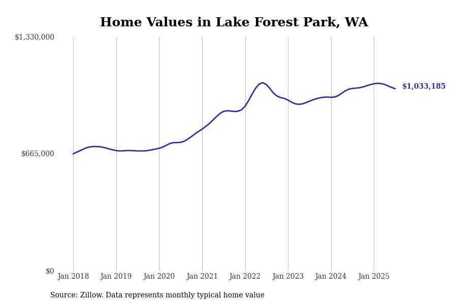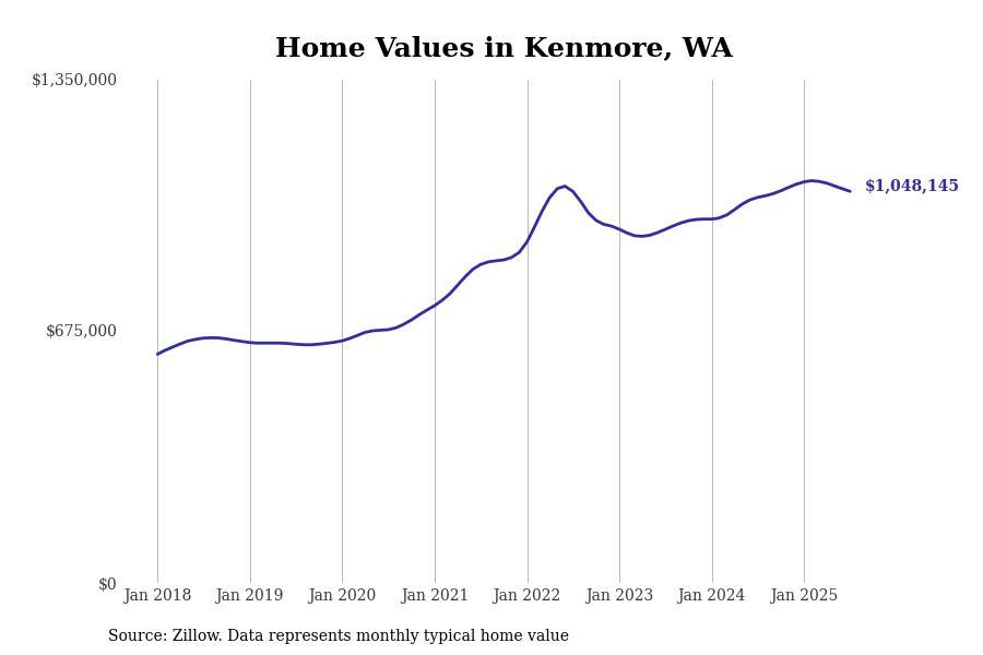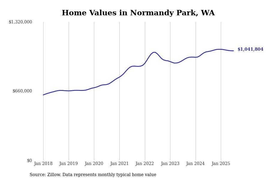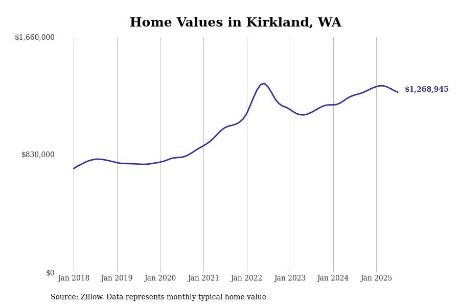 Stacker compiled a list of cities with the most expensive homes in the Seattle metro area using data from Zillow. Charts show the monthly typical home value since January 2018. Data was available for 96 cities and towns.