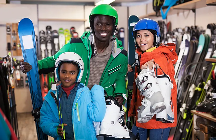 Even if you think skiing will become a permanent family hobby, renting gear for everyone the first time out is best. For kids, renting for several years can be more cost-effective until they wear the same size for more than one season! Don’t forget goggles, a helmet, and proper jackets, gloves, skis, and boots. Coordinating with bright colors can make your kids easier to find on the slopes, too.