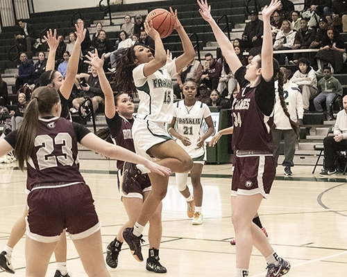 Franklin opened the second half with a quick basket from Carrington, stretching the lead to 27–13. Although Holy Names turned it over, they bounced back with a three-point shot from Allie Herdener, trimming the margin to 27–16. But Franklin quickly regained control. Sanh hit a three-point shot, and Chappell added two more free throws to push the lead to 32–16.