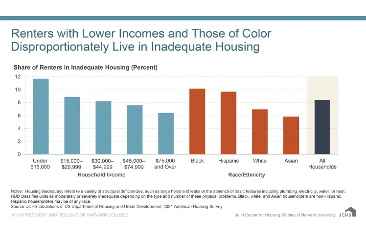 Among the 14.6 million renter households comprising the working poor – those earning $30,000 or less each year – had median cash savings of just $300 and total net wealth of only $3,200. They were also the most likely to live in substandard housing with multiple problems such as structural deficiencies, a lack of upkeep, or the inconsistent provision of basic features such as hot and cold running water, heat, and electricity. Households with lower incomes and households of color are disproportionately exposed to substandard conditions.