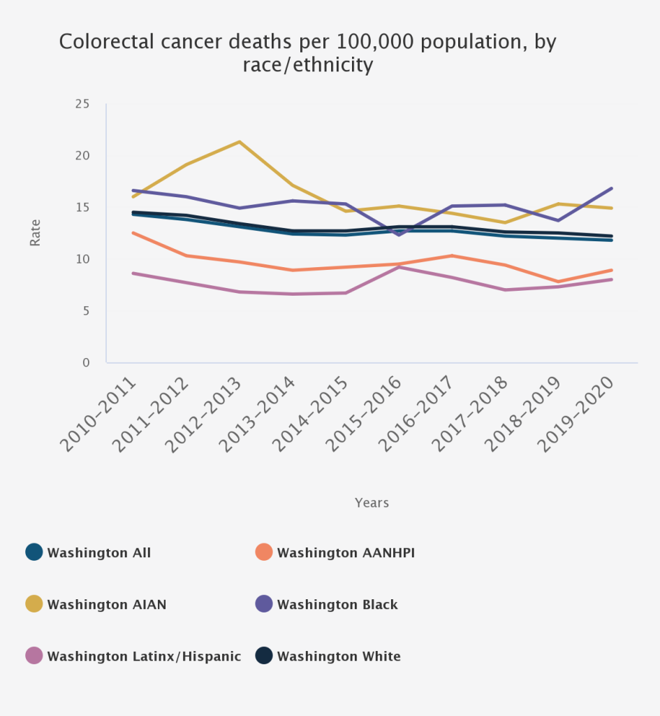 “Nationally in the U.S., Black men and Black Americans have the highest incidence rate of colorectal cancer and highest mortality rate, compared to White, Asian/Pacific Islander, and American Indian/Alaskan Native Americans,” says Olson. “In King County, among adults ages 50-75 years of age, 28% of Black residents had not met colorectal cancer screening recommendations. This is similar to rates for King County overall, but less than White residents. We don’t have King County-specific data for colon cancer rates, but at the state level we know that Black residents in Washington had a higher rate of colorectal cancer compared to White, Asian, and Hispanic residents.”