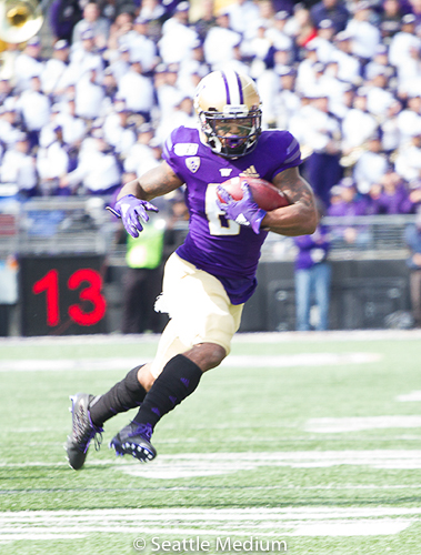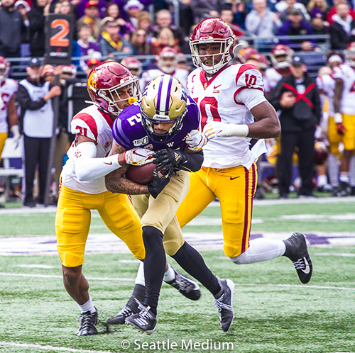 Three plays into USC’s ensuing drive, Washington was able to get their first take away of the ballgame. USC quarterback Matt Fink, who came into the game against Utah and had a big game last week, was picked off by UW freshman defensive back Cameron Williams, who returned it 14 yards to the USC 38 yard line. The turnover set up another short Washington drive that culminated in the Huskies’ second touchdown of the day as UW running back Salvon Ahmed fumbled the ball at the goal line, only to be recovered in the endzone by wide receiver Andre Baccellia to give Washington a 14-0 lead.