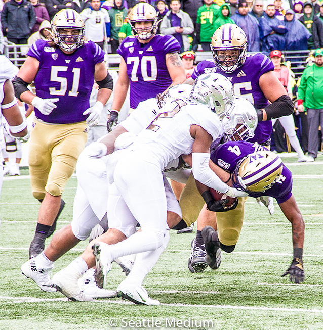 In the first half Washington was able to lean on their running game. Ahmed finished the half with 81 yards on 13 carries. The Huskies’ success with the run opened up the big play opportunities that came in the passing game. Washington continued to utilize that strategy to begin the second half with a big 20-yard run followed by an 8-yard run by Ahmed. That set up a 33 yard touchdown pass from Eason to freshman wide receiver Nacua Puka giving Washington a two touchdown lead, 28-14 Huskies.