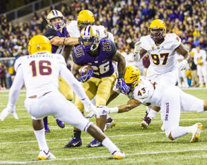 It was not the best start for Washington. Washington’s first play from scrimmage resulted in an interception but was not credited to quarterback Jake Browning. The Huskies opened the game with a double pass from wide receiver Andre Baccellia that was picked off the Sun Devils and returned to the Husky 20-yard line. The interception set-up a 1-yard plunge by Arizona State running back Eno Benjamin giving the Sun Devils an early 7-0 lead.