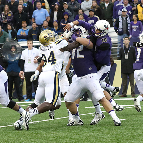 Husky linebacker Hau‘oli Kikaha effectively killed UCLA’s initial drive in the first quarter, sacking UCLA quarterback Brett Hundley for a four yard loss at the UCLA 49-yard line. With that sack, Kikaha recorded his 14th straight game with a sack. He also set a Husky all-time single season record as he has accounted for 116 yards lost, beating the record set by Dennis Brown. Unfortunately, Kikaha left the game with an injury and the Husky defense struggled to contain the Bruins unrelenting march up the field.