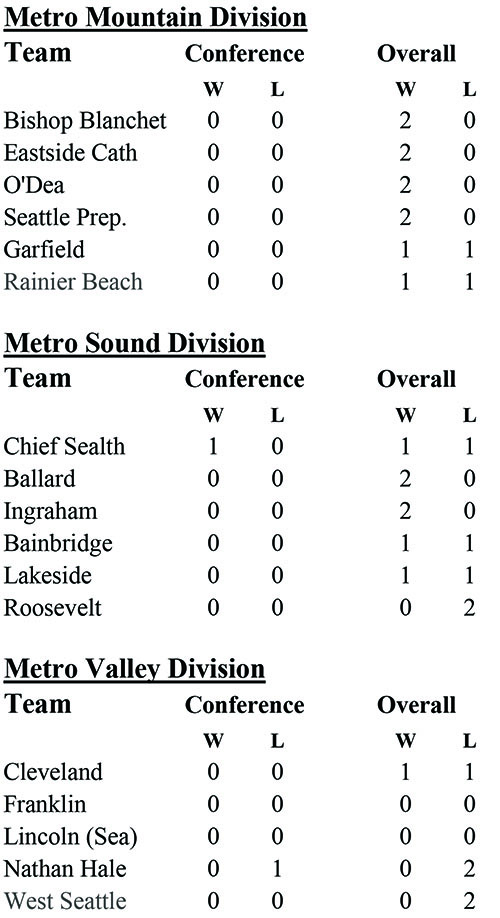 Presented By: Metro League Football Standings 9-18-19 September 19, 2019 Share this: Share on Facebook (Opens in new window) Facebook Share on X (Opens in new window) X Share on LinkedIn (Opens in new window) LinkedIn Email a link to a friend (Opens in new window) Email Print (Opens in new window) Print FacebookTwitterWhatsAppEmail Nduka Leads Eastside Catholic Past Bellevue For Girls 3A State Title Rainier Beach Wins Boys 3A Basketball Title With Dominant Win Over... Rainier Beach’s Championship Brotherhood: How Culture, Chemistry And Coach Mike Bethea... Amy Nduka Scores 23 Points To Lead Eastside Catholic To State... Bellevue Defeats Roosevelt 51-47 To Advance To Girls 3A State Championship Shareef-Dulanaey’s Heroics Propel Lincoln Abes To State Final Beach Boyz Advance To State 3A Championship Game With 71-49 Over... Roosevelt Advances To Girls 3A Semifinals With 49-41 Victory Over Lakeside Eastside Catholic Post Dominant Win over White River To Advance To... Eastside Catholic Advances With 53-37 Victory Over Mt. Spokane Rainier Beach Rallies To Beat O’Dea 85-68 Lakeside Defeats Ridgeline 55-41, Advances To Girls 3A Quarterfinals