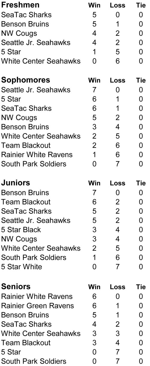 Youth Football Presented By: NW Premier Football League Standings 10-21-15 October 21, 2015 Final Regular Season Standings For The NW Premier Football League: Share this: Share on Facebook (Opens in new window) Facebook Share on X (Opens in new window) X Share on LinkedIn (Opens in new window) LinkedIn Email a link to a friend (Opens in new window) Email Print (Opens in new window) Print FacebookTwitterWhatsAppEmail Benson Bruins Roll To 31‑6 Victory In WYFL 8U Championship Rise Wins WYFL 10U Title With 26-6 Victory Over Federal Way Benson Rallies From 18 Points Down To Win WYFL 12U Championship... Benson Bruins Outlast Royal T Titans To Win WYFL 14U Championship,... Benson Bruins Shut Out CD Panthers 18-0 To Win WYFL 6U... Football, Family, And Faith Are What Drive Royal T’s Chris And... Discipline, Heart, And Teamwork Drive B12 Bearcats’ 8U Championship Run Royal T Titans Use Second-Half Surge To Defeat B12 Bearcats 51–25,... B12 Bearcats Surge Past CD Panthers, 33–19, To Reach 8U Championship 8U Benson Bruins Cruise Into Championship Game With 40-0 Victory Over... Federal Way Hawks Rally Late To Defeat Benson Bruins 7–6 And... Rise Defense Shuts Out Bruins To Their Punch Ticket To 10U...