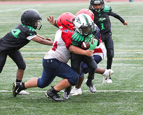 Quarterback Micah Meneese had another monster game leading the undefeated Bruins to their fourth straight shutout. Meneese had five touchdowns in the first half – two quarterback keepers and three on beautiful passes to KJ Hightower (two) and Ray Clark III. Liufau Loumoli and KJ Hightower set the tone defensively and helped Benson achieve this win. The Bruins are 5-0 for the season. No team comes into a contest with a loss on their minds and the Seatac Sharks are no different. The Sharks fought valiantly and competitively but this week came up short.