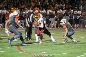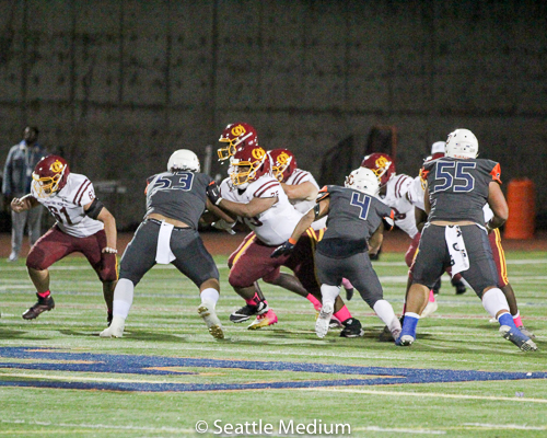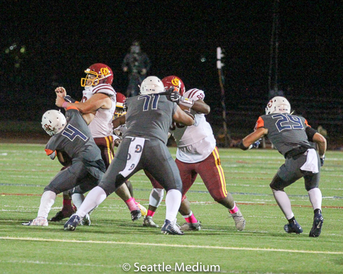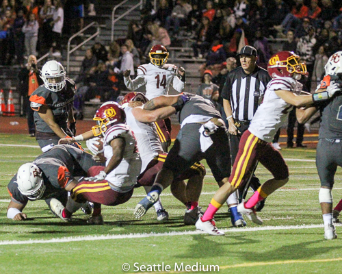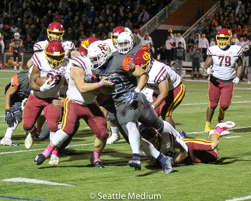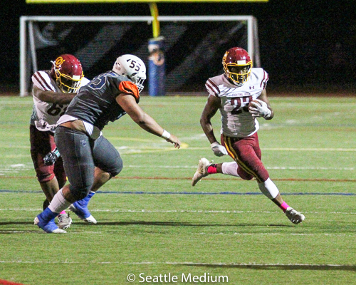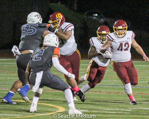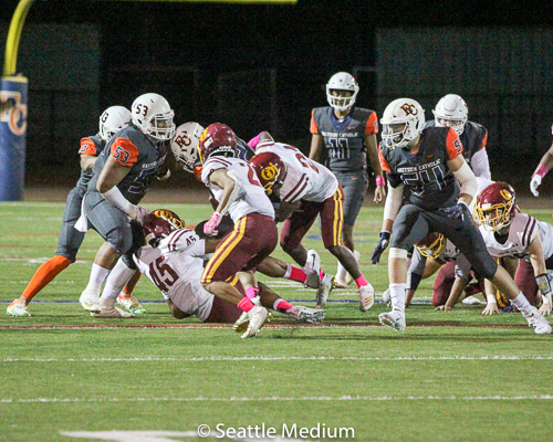 The name of the game last night for O’Dea was ground and pound with a total of 257 yards rushing on 54 attempts. Senior running back Cameron Daniels inserted himself from the outset, running with reckless abandonment between the tackles and leading to a late first quarter score by Daniels on a 4-yard power play up the gut.