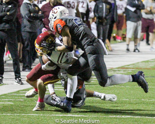 Eastside Catholic got off to a sluggish start to the game, more in due to the physical, hard-nosed play of the Irish defense. The Crusaders first touchdown came late in the second quarter after a unfortunate miscue of a muffed punt for the Irish placed Eastside solidly at the Irish 11-yard line in scoring position. Eastside Catholic junior quarterback Kobe Mausau was able to connect on a 6-yard touchdown pass to junior tight end Tavarus George to bring the score to 7-6 O’Dea, after a failed field goal attempt by the Crusaders.