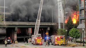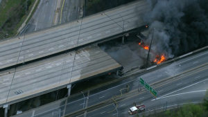 The fire started underneath part of the highway on Thursday evening. At about 7 p.m., an elevated section of the northbound interstate collapsed, forcing frantic motorists to seek alternative routes.