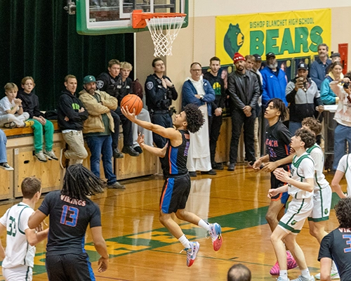 A quick assist from Rainier Beach’s Louis Harris to Achillies Reyna for two points, and a powerful dunk from Stokes to start the quarter brought Blanchet’s student section to its feet. Blanchet’s Oliver Wade managed to steal the ball from Stokes but wasn’t able to convert on his shot attempt. On the next play, Blanchet was able to get another steal, which ended up back in the hands of Wade, who was able to convert this time as the Bears cut the Rainier Beach lead to 36-14.