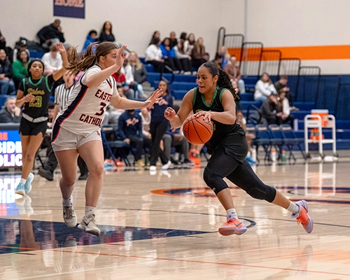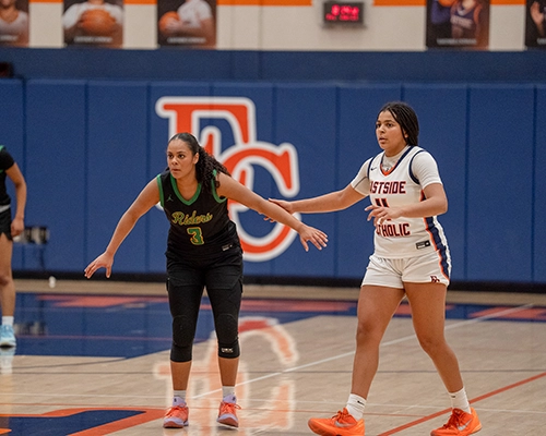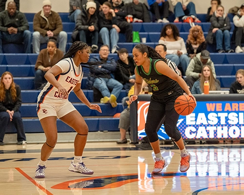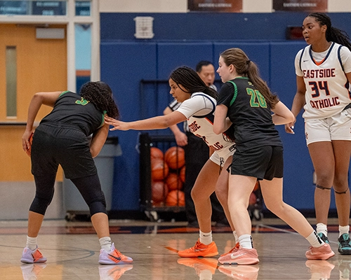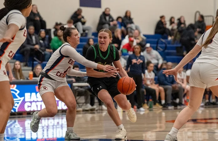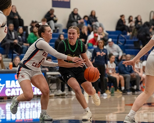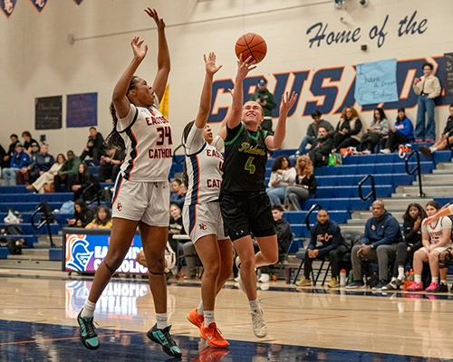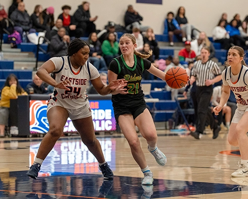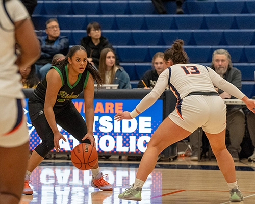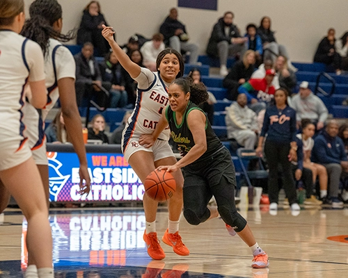 Roosevelt’s shooting ability from outside was impressive, and they were just started to heat up. Giselle Dollar would connect on another three-point shot for the Roughriders. Despite the hot shooting by Roosevelt, Eastside Catholic managed to stay composed, getting a tough finish from Nduka and tightening up and intensifying their own defensive efforts. Dollar would hit another three-point shot, and Nduka would respond with a three of her own to give the Crusaders a two-point lead at 35-33.