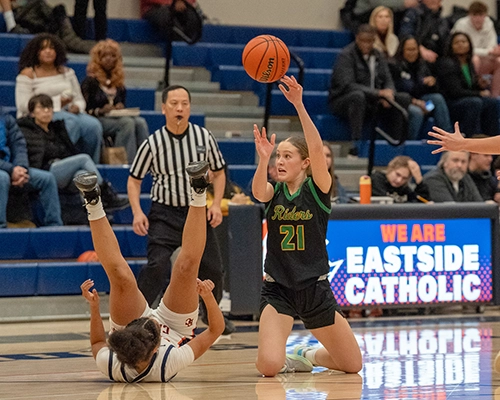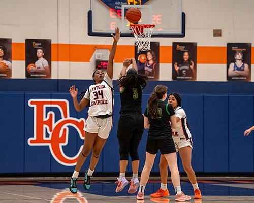 Roosevelt’s Carmen Derda scored the first points of the third quarter, but Eastside Catholic quickly responded and took control with a 7-0 run fueled by defense and aggressive play in the paint, as they increased their lead to 46-37, after points that included a basket by Nduka, a fadeaway by Sophie Lugolobi, two-points chipped in by Raquel Dunnam, and a 1-point conversion at the line by Lugolobi.