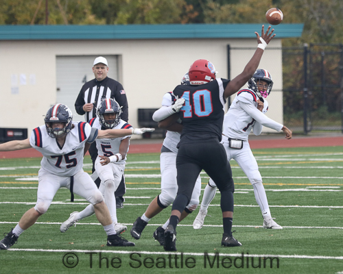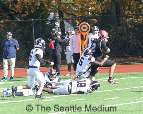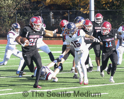 Chief Sealth’s Marshawn Tovia-Ford finished the game with three touchdowns — a rushing score, a receiving touchdown, and a pick-six on defense. Quarterback Mason Filitaula threw three touchdown passes, connecting with Graham Hull, Xander Gomez and Tovia-Ford. Marquis Tovia added a rushing touchdown and also recorded an interception, while Kingston Cappiello contributed a rushing touchdown of his own.