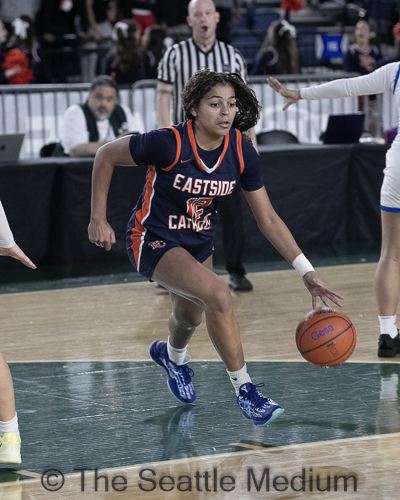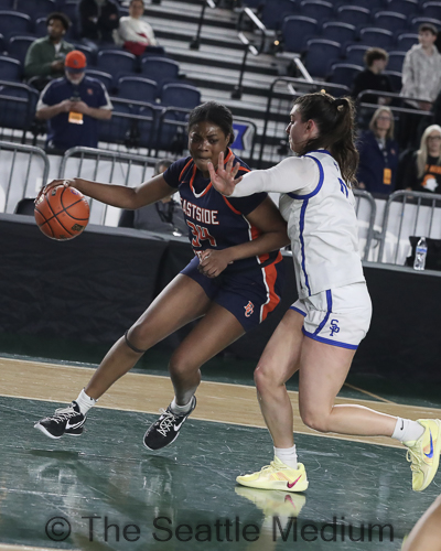 Both teams got off to a slow start after the break, as neither team was able to score in the first three minutes of the half. Nduka then made a basket with a little over five minutes remaining, bringing the score to 24-22. With 3:45 remaining, Seattle Prep’s EJ Ovena drained a three-point shot to extend the Panthers’ lead to 28-23. Renners then followed with a layup that caused Eastside to call a full timeout. After the timeout, the Crusaders regrouped and went on a 4-0 run to narrow the Seattle Prep lead to 30-27 with 30 seconds remaining in the third quarter. Tavia Carter then sent Ovena to the line, where she converted both free throws to make the score 32-27. Lugolobi hit a two-point buzzer-beater shot to end the period with Seattle Prep leading 32-29.