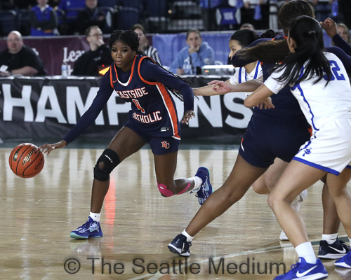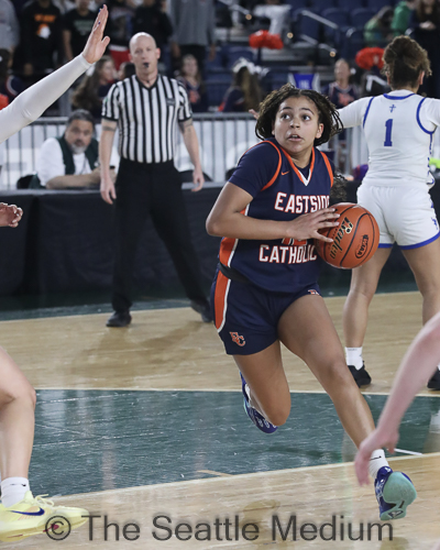 The first quarter of the game flew by very quickly as the two teams battled back and forth throughout the period. It was a see-saw battle. Seattle Prep defensive stopper Kylin Kinchen picked up her second foul with just 30 seconds remaining. Eastside Catholic’s Sophie Lugolobi and Tavia Carter both scored five first-quarter points as the Crusaders held a 12-11 lead at the end of the opening quarter.