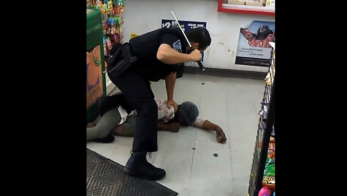 The officer strikes her several more times as the woman squirms on the ground.