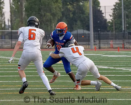 The Cougars started the first quarter with possession of the ball and high spirits. But Rainier Beach’s Achilles Reyna had other plans. Reyna’s tackle of Central Kitsap’s Larry Williams Lii on the first play of the game sparked a flurry of intense defensive stops by the Vikings. The Vikings’ Zevion Watkins stopped Central Kitsap’s Mason Raty after a short gain, and although Rainier Beach incurred a 5-yard offsides penalty, the Vikings continued to build momentum as Willie Manning III and SirJewel Glover recorded back-to-back tackles, forcing the Cougars to punt on fourth down.