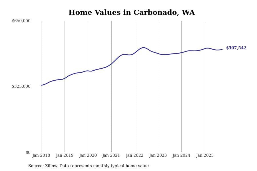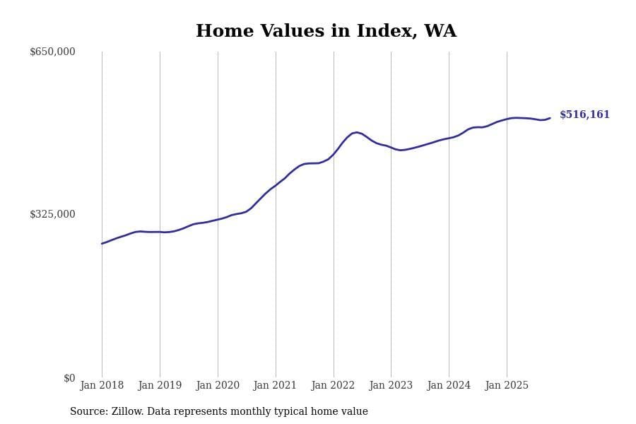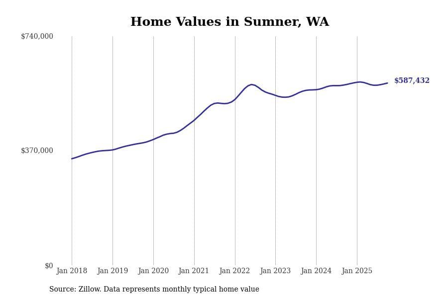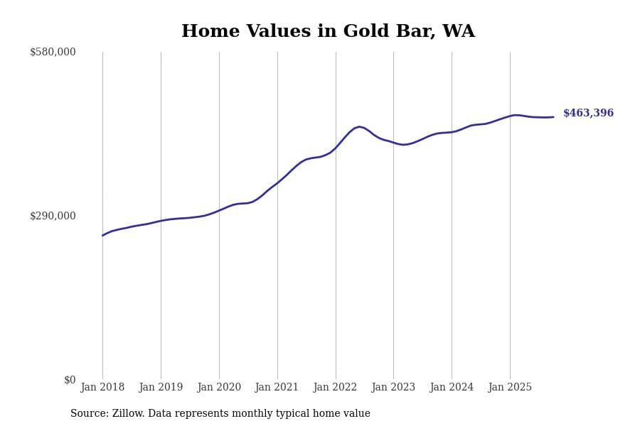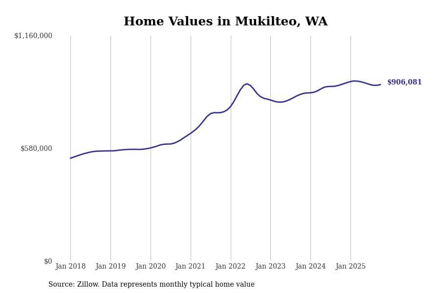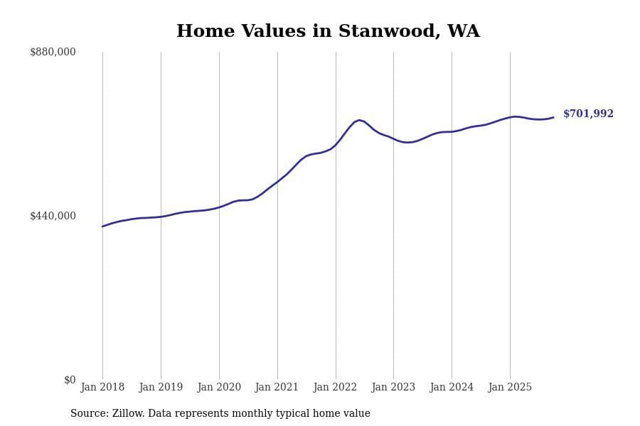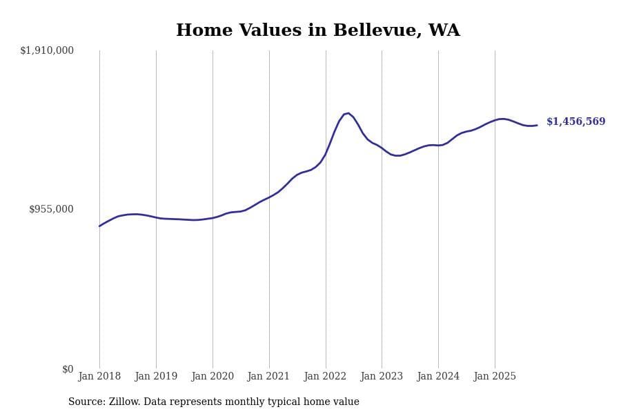 Stacker compiled a list of cities with the most expensive homes in the Seattle-Tacoma-Bellevue, WA metro area using data from Zillow. Charts show the monthly typical home value since January 2018.