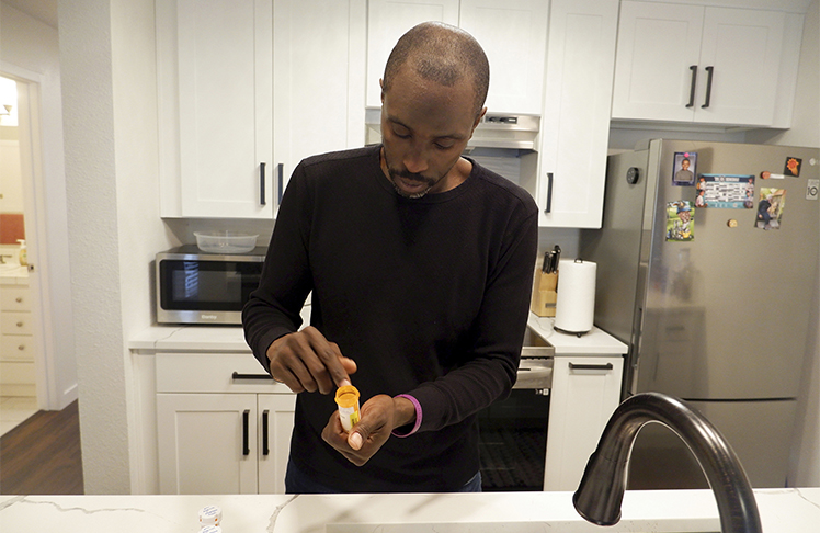 Anthony Jones takes his daily lupus medication and supplements at his Seattle apartment on June 20, 2023. Diagnosed with the disease when he was 19, Jones sometimes has difficulty making it to work when his lupus flares up. Washington lawmakers had cases like his in mind when they passed a new long-term care tax that takes effect July 1, making Washington the first state in the nation to deduct money from workers’ paychecks to finance long-term care benefits. (AP Photo/Ed Komenda)