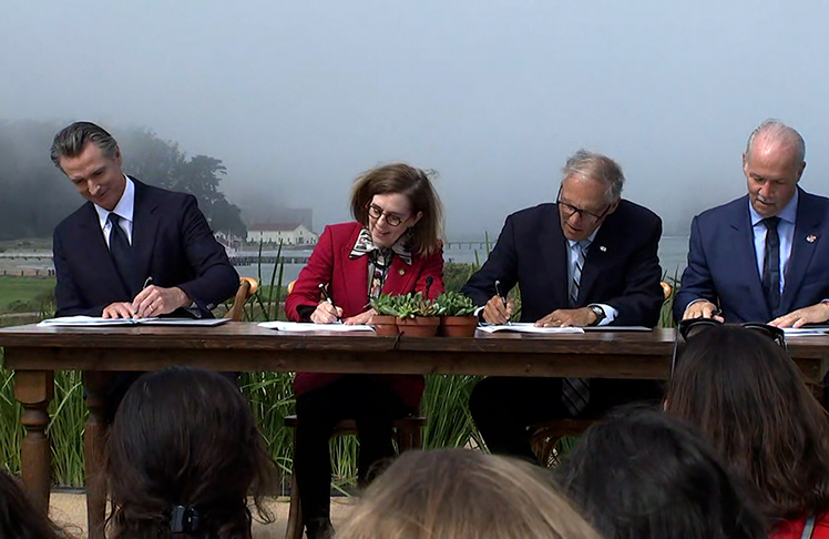 The governors of California, Oregon, Washington and the premier of British Columbia gathered in San Francisco Thursday to sign an agreement to decarbonize the electric grid, speed the transition to electric vehicles and make their communities more resilient to climate disasters including drought, wildfire, sea-level rise and extreme heat.